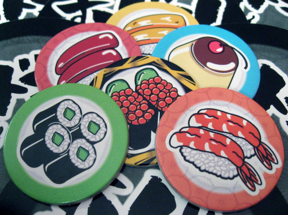 Next we played our “Feature Game” which was Sushi Draft!. This game is similar to 7 Wonders in that it is based on “card drafting”, however, the aim is far less complex. The story goes that the children are having a competition to see who can eat the most of one type of sushi at a Japanese family feast. Mother, however, wants the children to eat a balanced diet, and will give pudding to the one who eats the most varied meal. Therefore, the aim of the game is to try to do both. Players start with a hand of six cards and then simultaneously play one before passing all but one of the remaining cards on to the next player. Play continues until everyone has played five cards at which point the scores are evaluated and players with the most of each type get a corresponding token and the player with the most different types gets a token. If there is a draw, then the next highest player gets the token. About half-way through we realised that some sushi were more valuable than others which changed the game somewhat, but the damage was already done and the winner had already collected the highest value tokens.
