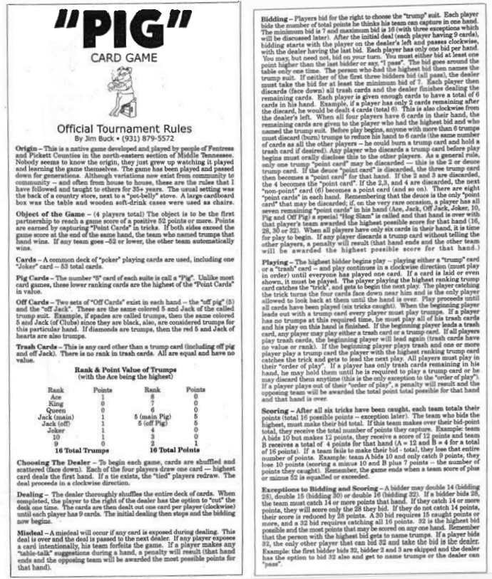 Pig (aka Spoons) is a simple little card game that uses a form of card drafting where players repeatedly pass a single card to the left and pick up a card from the right.  The game is fun and can be quite manic until the point that a player has four of a kind, when they put their finger on their nose (or grab a spoon from the centre of the table).  Everyone else copies and the last person to notice and put their finger on their nose (or get a spoon) is the loser, or “Pig”.  In Forbus, Tennessee, the game Pig is very different however, and taken much more seriously.  The Forbus Pig game is a partnership trick taking game, similar to Bridge, but is only played in the local area.  The “18th Annual World Pig Tournament” was won last weekend by Larry Padgett.