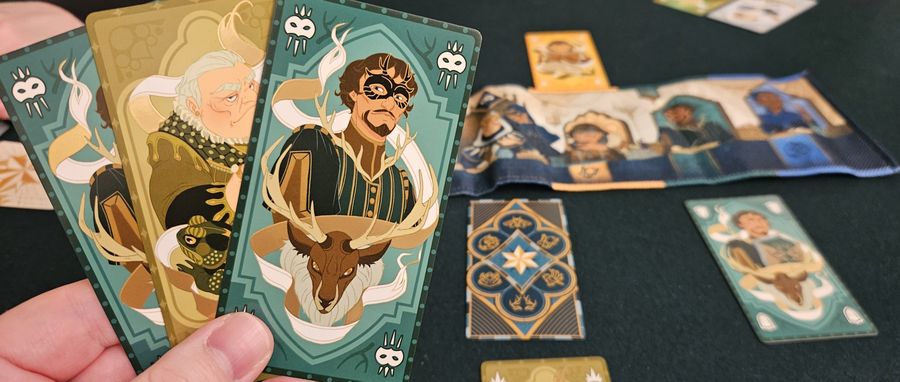 Meanwhile, on the next table Teal was leading a game of Salmon Run with Green, Pine and Lilac. This is a game that was played quite a few times in the group some years ago when it was first released, but the last time it got an outing was in 2015—nearly ten years ago. Teal had decided that his copy had been sitting on the shelf unplayed and unloved for too long and it was time for it to move on. It got a stay of execution though, and as a result, it got a Tuesday night outing. A fast paced, deck-building, race game, Salmon Run is a sort of cross between Dominion and Flamme Rouge. Although the game is not particularly complex, the first game was a learning game.