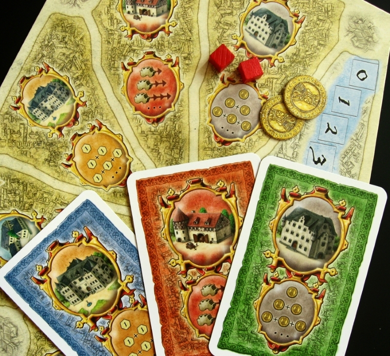 Meanwhile, on the next table, Amerigo was going full steam ahead. In this game players are exploring the islands of South America, securing trading routes, and building settlements. The game board is made up of a four by four grid of large tiles that make an archipelago. Players then have two ships each which they sail through the maze of islands, mooring at natural harbours to build trading posts, and then expanding settlements. The actions available to players are determined through the use of a special cube tower that contains lots of buffers and buttresses. The idea is that each of the seven actions has an associated set of coloured cubes: blue for sailing, black for loading cannon, red for buying buildings, green for settling etc. At the start of the game, all the cubes are put into the top of the tower a small number get stuck and remain inside the tower to be potentially knocked out at a later point in the game.
