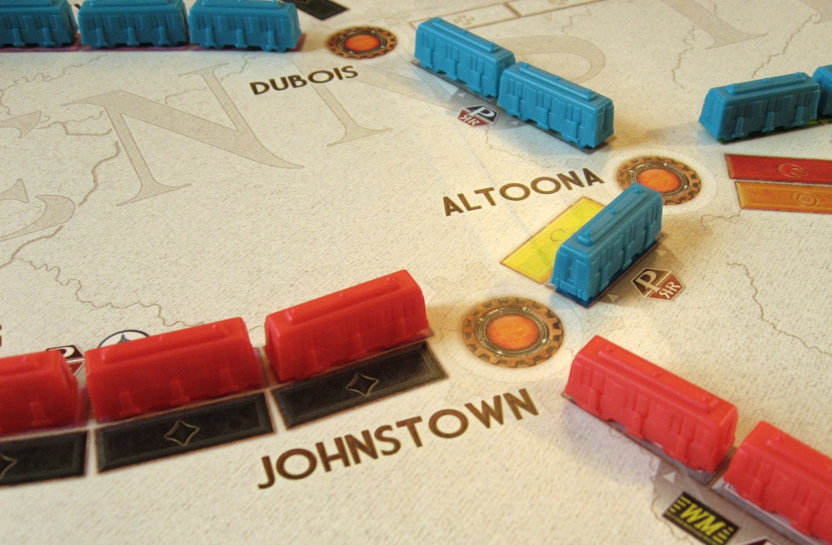 Burgundy was quite pleased with his starting tickets getting three east-west routes that he thought could largely be coincidental.  His delight faded to despair, when in the first turn, Blue took the route from Altoona to Johnstown and quickly followed it by adding the Altoona to Dubois, in quickly completely scuppering his plans.  Magenta was equally unimpressed that double routes were not in use when Burgundy and Blue quickly completed all the connections to Johnstown rendering one of her tickets impossible within the first few turns.  From there, the game quickly descended into a knife-fight in a phone box with everyone scrabbling to make their starting tickets and it looking very much like nobody was going to succeed.