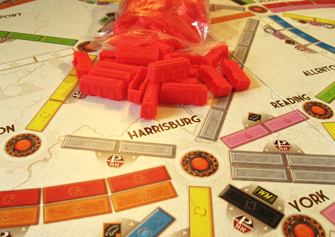 The basic Ticket to Ride game is really very simple.  On their turn the active player can do one of three things:  pick up two coloured train cards from the face up display or the face down draw deck; place plastic trains on the map using cards to pay and scoring points; or draw ticket cards, which name two places and give points at the end of the game if the player has built a route between them, but score negatively if not completed.  From there, each different version makes small changes to the rules, for example, some editions include tunnels and/or ferries and sometimes there are extra cards or bonus points etc..  So, the first problem was trying to remember which of the specific rules are applicable to the base game and then integrate them with the new rules for the Pennsylvania map.  In particular, this was whether we should be using the double routes and how many points the different routes should be worth since there was no score table.  Eventually, we decided to use single tracks (ala three player Ticket to Ride: Europe) and scored routes as follows:
