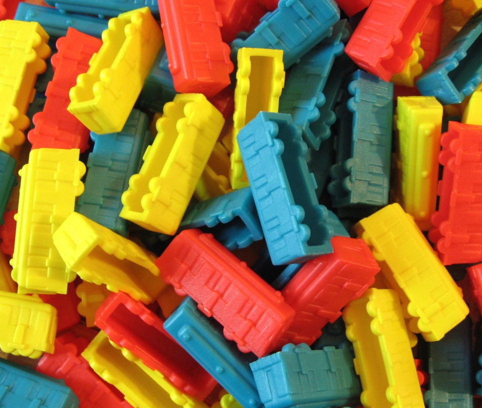 Over the course of the next couple of rounds, the game board became more crowded and there was even the odd cheeky raid on a village.  By this time, Grey had managed to create a nice evenly built village wall, one or two bricks high made up of both grass and wooden bricks (worth one and two points respectively) – easy pickings in a fight, but less threatening too. Green was a bit lopsided, concentrating on building with a range of brick colours mostly on one side in order to limit the attack directions.  Cerise however had quietly managed to built quite a good wall round a large part of her village with a lot of clay and stone bricks (worth three and four points).  So, the next two rounds were characterised mostly by Grey and Green attacking for Cerise’s wall.  The first attack by Green was successful, but only enough to nab the top green brick, hardly a dent at all and netted only one point.  Grey’s attack was a stalemate.