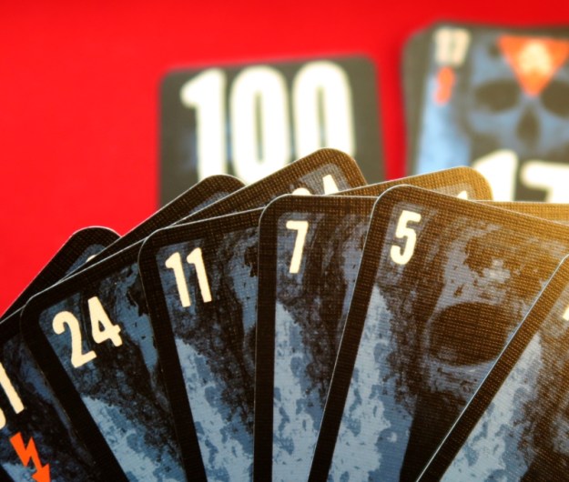 Byzantium was waiting for Plum to finish on the other side of the room, so Blue rejoined the group for a quick game of something silly—an old game that Blue and Pink acquired at Essen, called Why First?. The premise of this game is, what’s so important about being first, maybe the winner should be the person who is second. So in this game, players start with a hand of five number cards and simultaneously, chooses a card to play before, on the count of three giving it to someone. This player’s piece is then moved that number along the race track. The round ends after five cards, the last of which must be used to move the payers’ own piece.