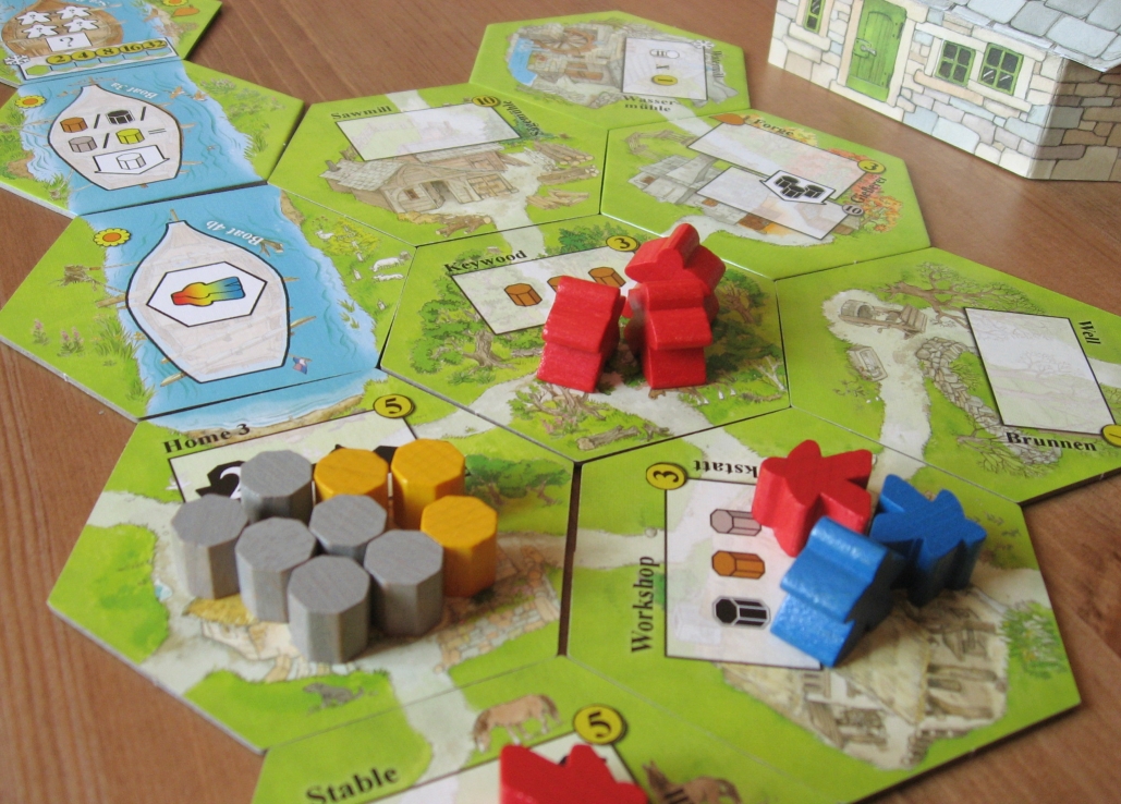 Despite the fact the group rarely plays cooperative games, everyone was keen to give Zoo Break another outing soon. Zoos were popular elsewhere too—the next table had been playing New York Zoo. This is a tile-laying game that got its first Tuesday outing only a few of weeks ago, but had been enjoyed by all. In this game, players add pens to their zoo, populating them with animals, and building attractions. Like Uwe Rosenberg‘s other similar games (including Cottage Garden, Spring Meadow, Indian Summer and Patchwork), it is Tetris-like but what makes this one unique and interesting is the Market.